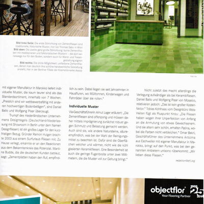 „Die traditionellen Zementfliesen mit ihren oft bunten Mustern sieht man jetzt häufiger auch im Ladenbau“, schreibt Stefanie Hütz, Autorin des Artikels „Fliesen mit Charme“ in der aktuellen Ausgabe der Zeitschrift „stores+shops“.