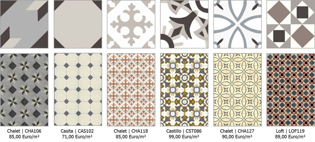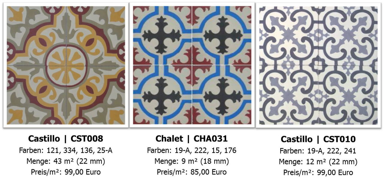 Die vollständige Liste mit der aktuell verfügbaren Lagerware an Zementfliesen finden Sie hier.