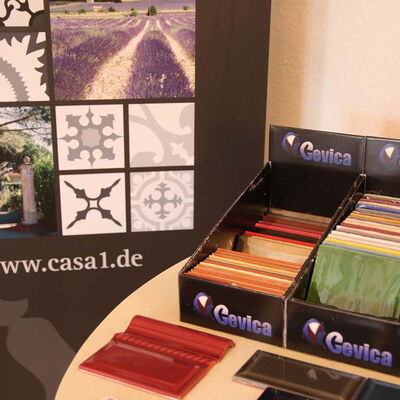 Nach und nach nahmen wir neue Produkte ins Sortiment auf, vor allem keramische Wandfliesen, die mit den andalusischen Fliesen harmonierten. Unser erster Partner in Sachen Keramik war die Firma CEVICA. Wir besuchten Messen und stellten selbst aus. Weitere Hersteller kamen hinzu: EQUIPE, AMADIS, ADEX – alle mit kleinformatigen Wand- und Bodenfliesen. Schließlich REVOIR PARIS mit einem außergewöhnlich schönen Sortiment an Feinsteinzeugfliesen für den Boden in Zementfliesenoptik.