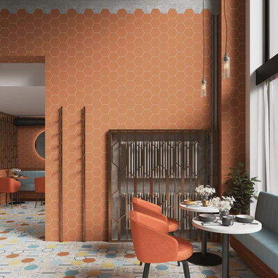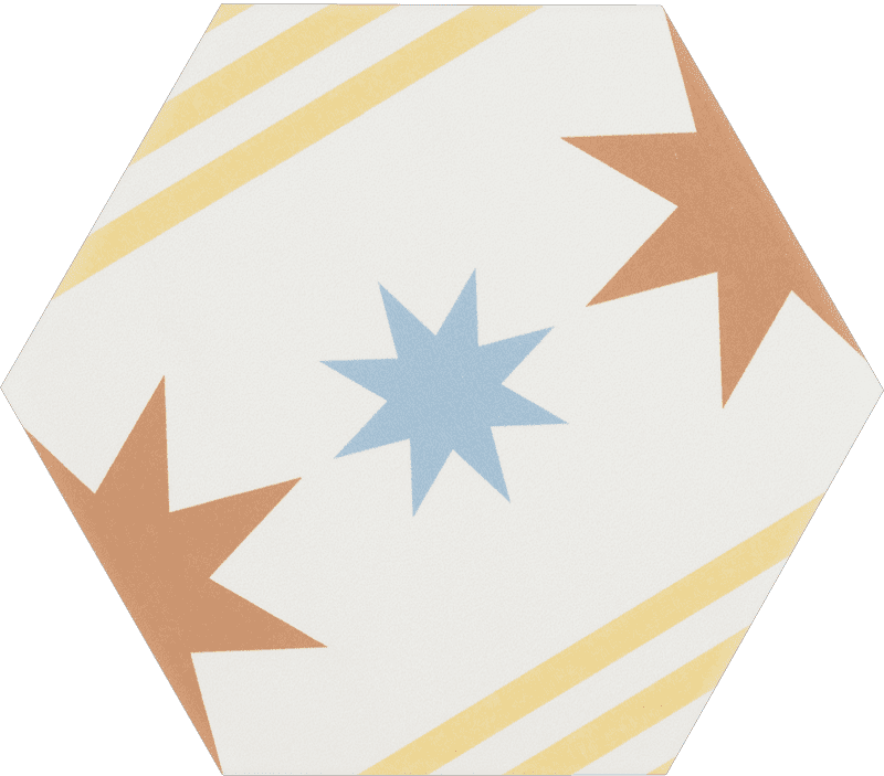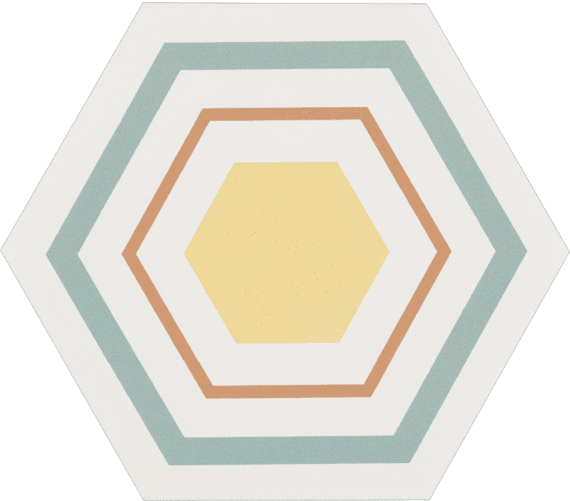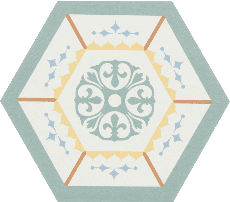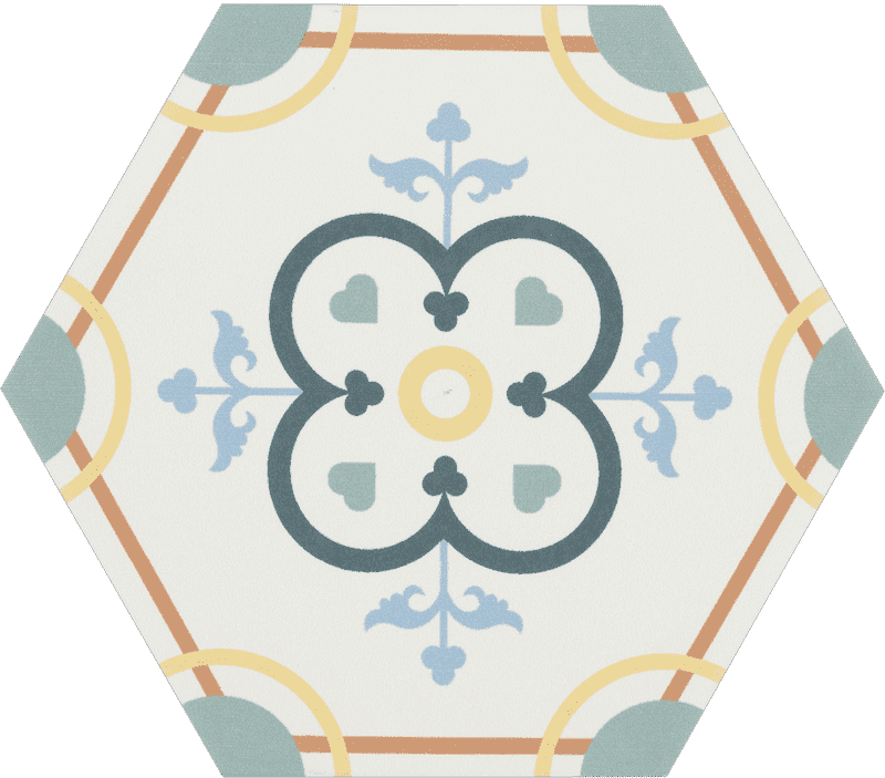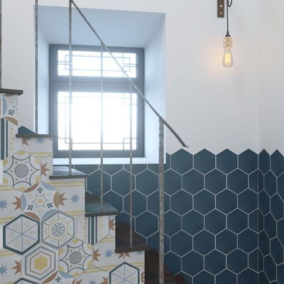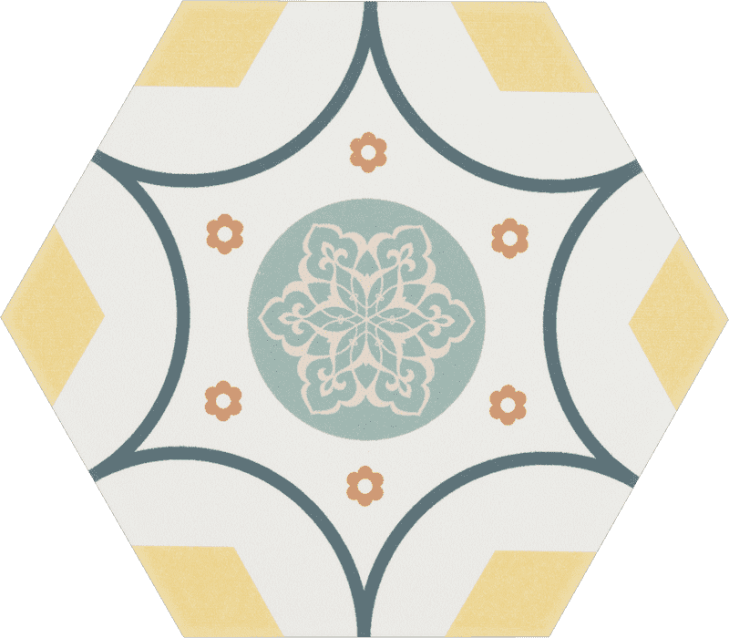 Bodenfliesen aus Feinsteinzeug im Sechseckformat 14 x 16 cm. Auch als Wandfliesen geeignet. Fröhliche Farben und Dekore, viele Gestaltungsmöglichkeiten. Gut kombinierbar mit der Serie Good Vibes. Diese Fliesen sind in Einheiten von 0,46 Quadratmetern (24 Fliesen) erhältlich (1 m² = 52 Stck.). Rutschhemmung: R10, Abriebfestigkeit: PEI4.*