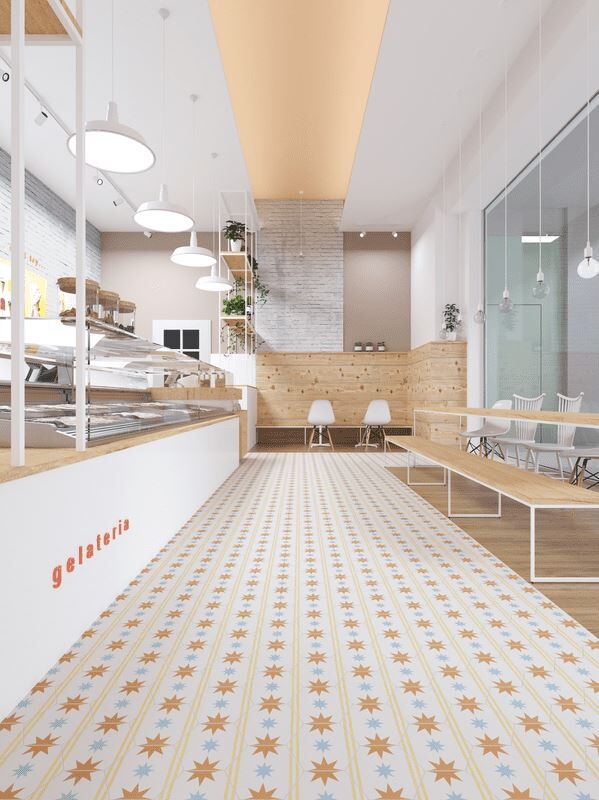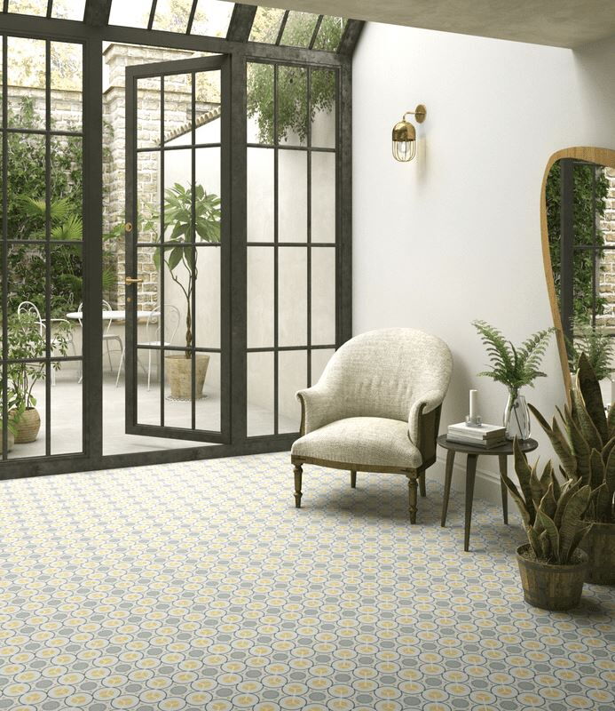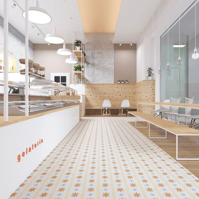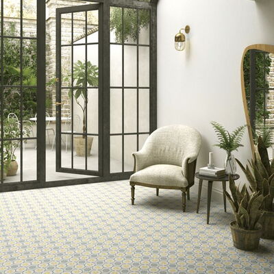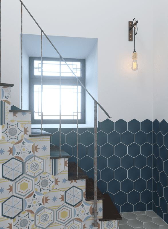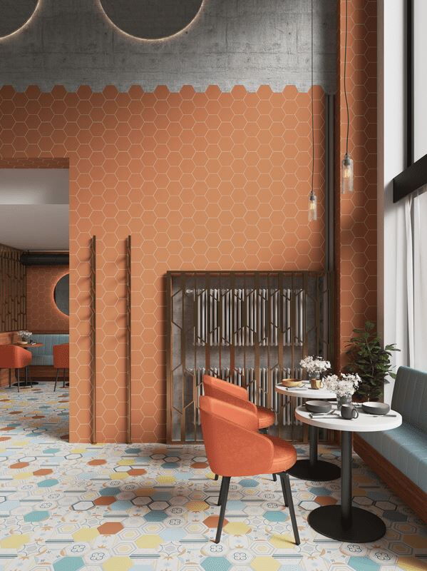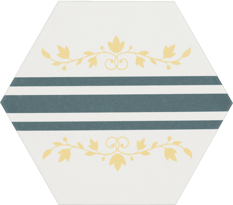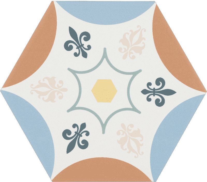 Bodenfliesen aus Feinsteinzeug im Sechseckformat 14 x 16 cm. Auch als Wandfliesen geeignet. Fröhliche Farben und Dekore, viele Gestaltungsmöglichkeiten. Gut kombinierbar mit der Serie Good Vibes. Diese Fliesen sind in Einheiten von 0,46 Quadratmetern (24 Fliesen) erhältlich (1 m² = 52 Stck.). Rutschhemmung: R10, Abriebfestigkeit: PEI4.*