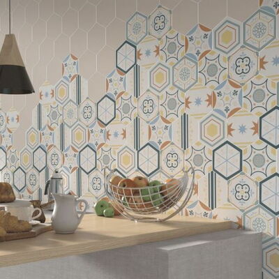 Die Dekorfliesen der Serie Boom (Sechseck, 14 x 16 cm) sind auch als fertige Designmischung erhältlich: