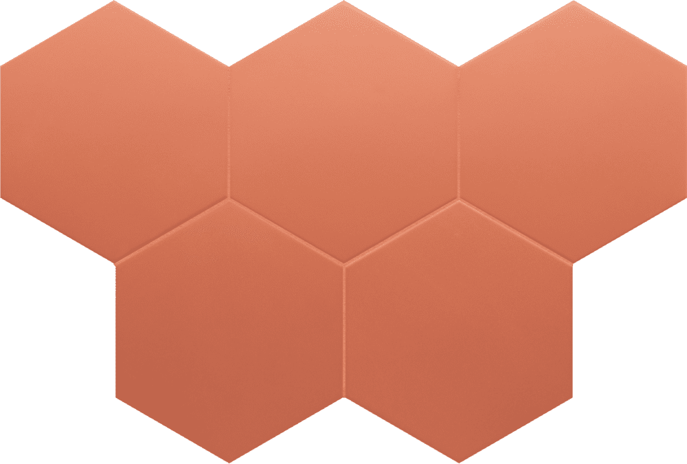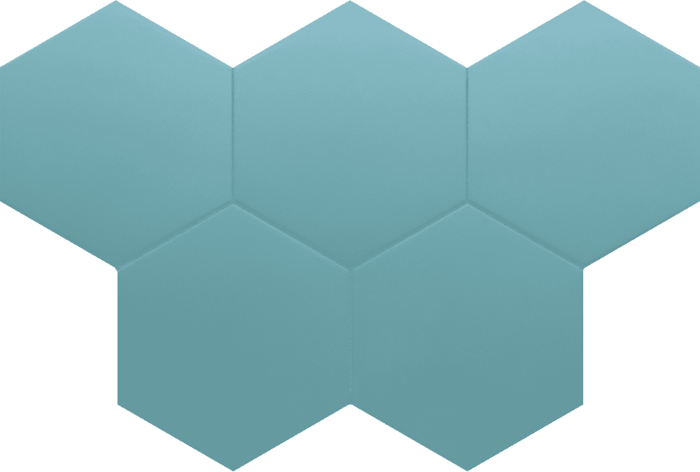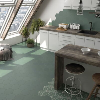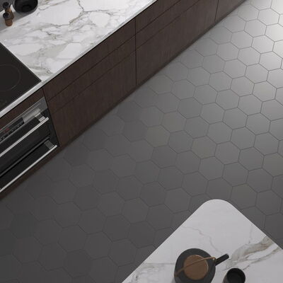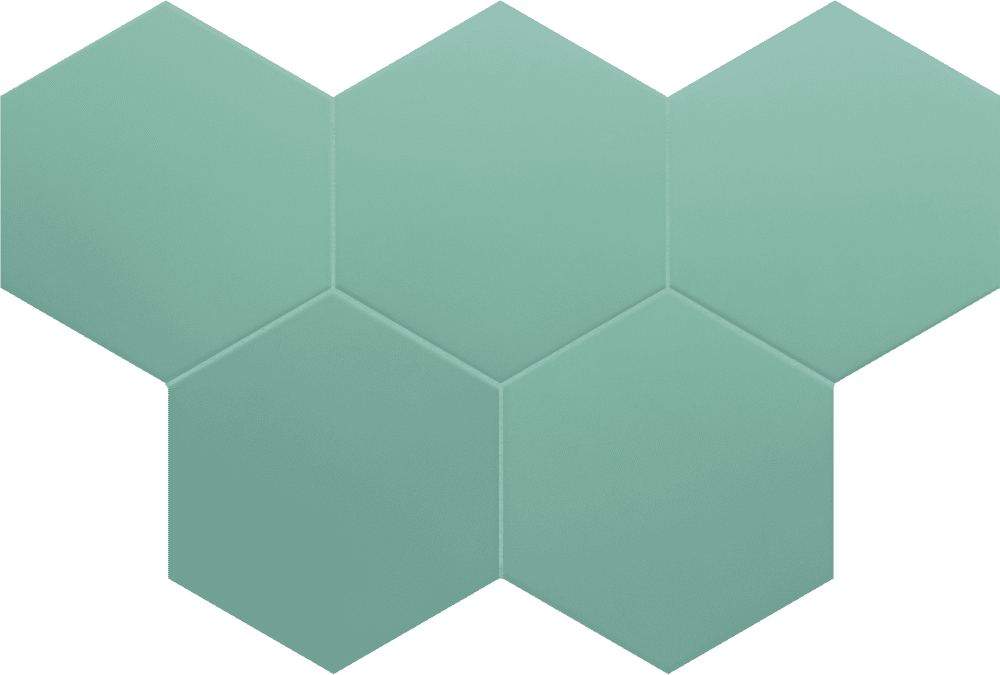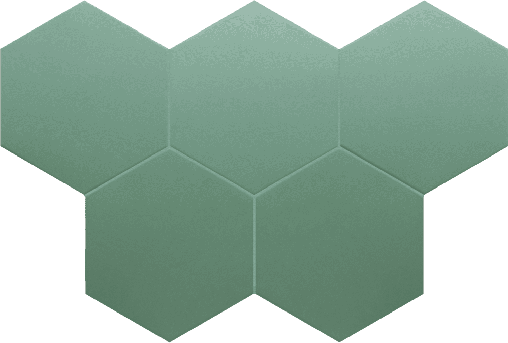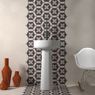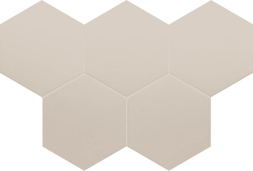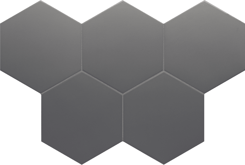 Feinsteinzeugfliesen für den Boden und die Wand. Hexagon/Sechseckformat. Feine Oberflächenanmutung. Mit und ohne Dekor. Format: 17,5 x 20 cm. Rutschfestigkeit: R9-B, Klasse 2*