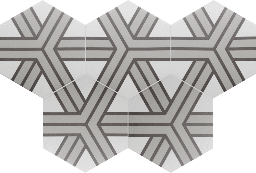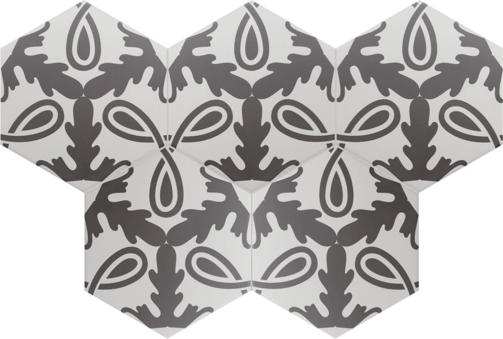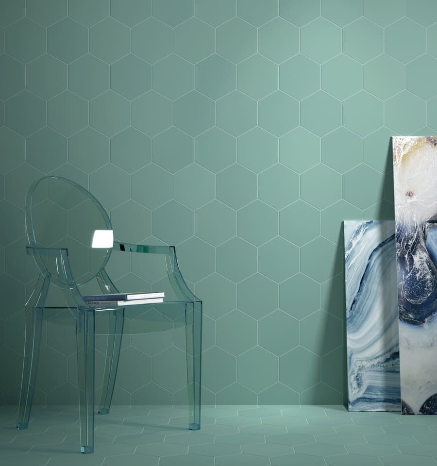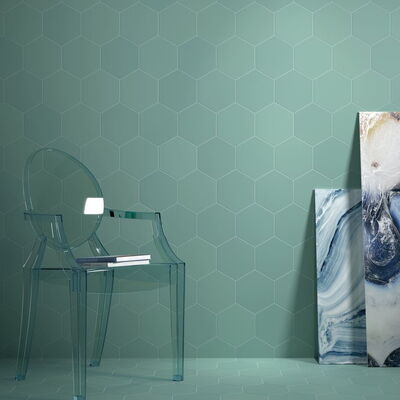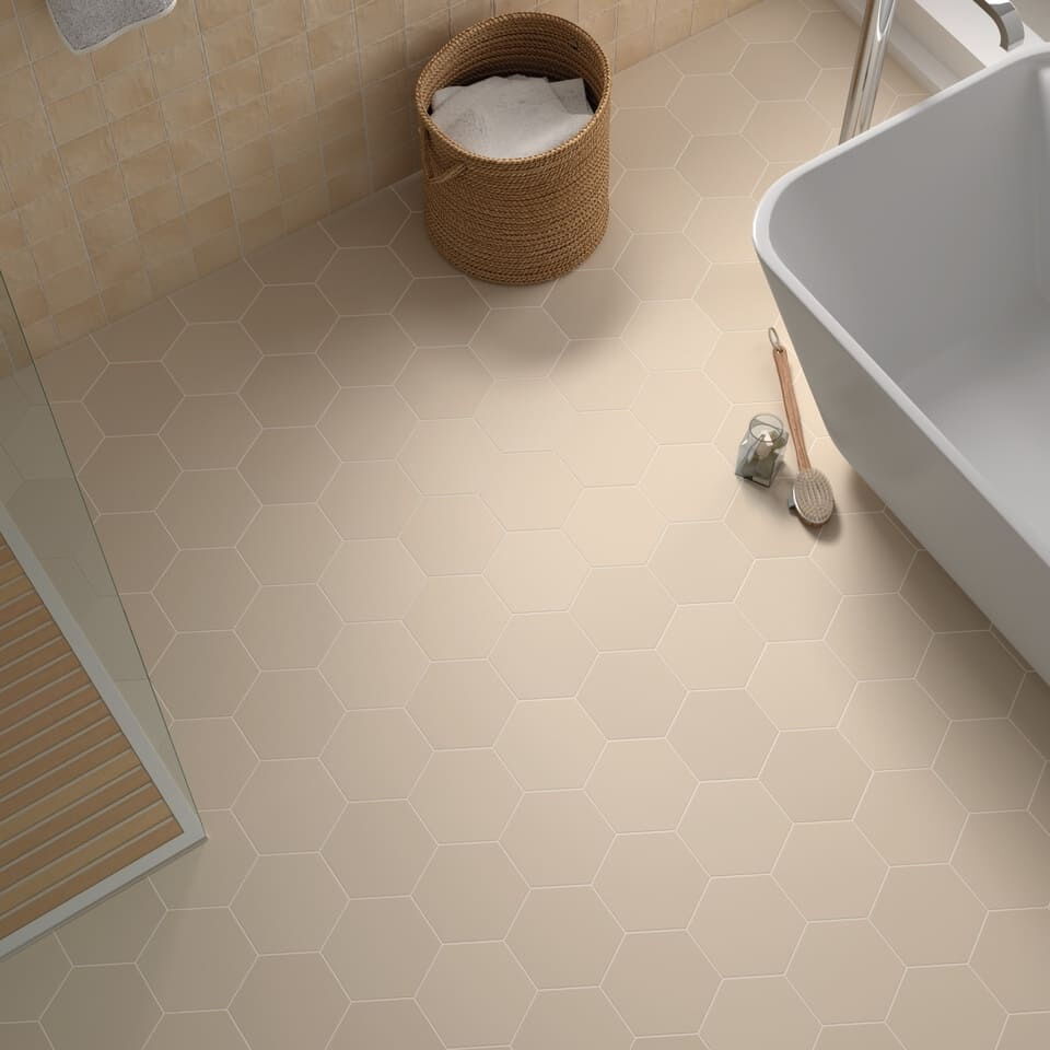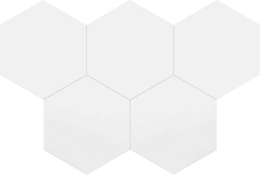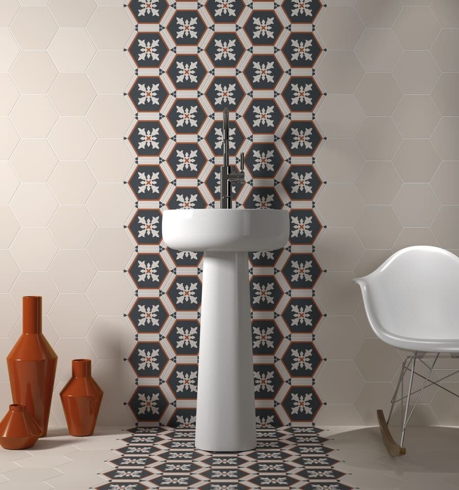 Feinsteinzeugfliesen für den Boden und die Wand. Hexagon/Sechseckformat. Feine Oberflächenanmutung. Mit und ohne Dekor. Format: 17,5 x 20 cm. Rutschfestigkeit: R9-B, Klasse 2*