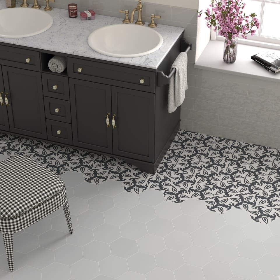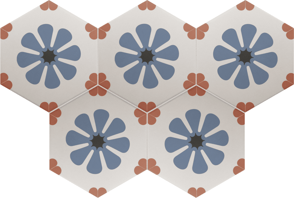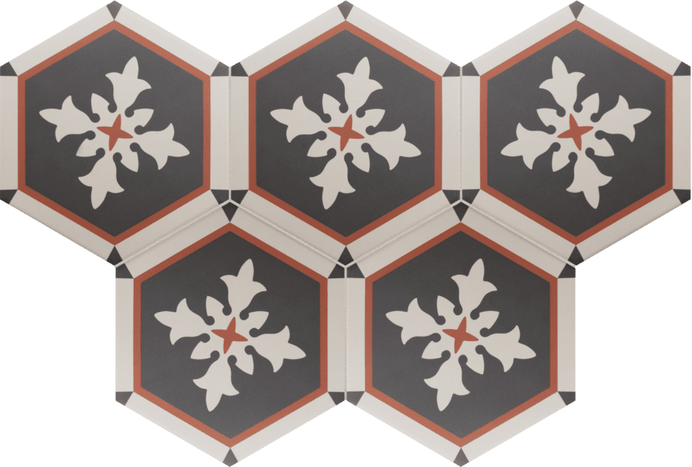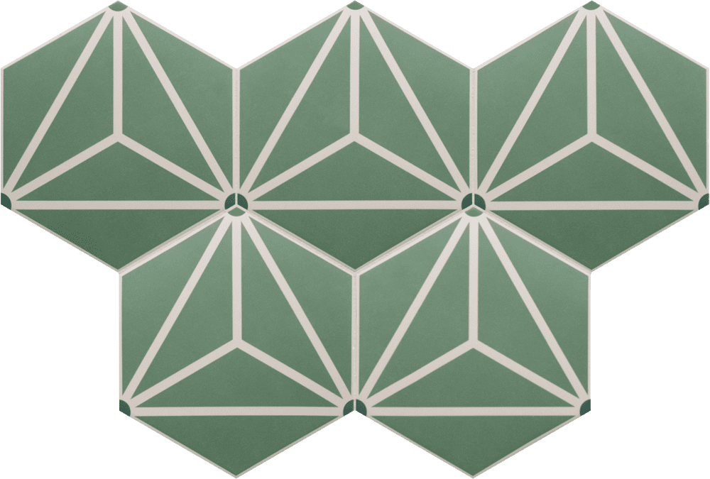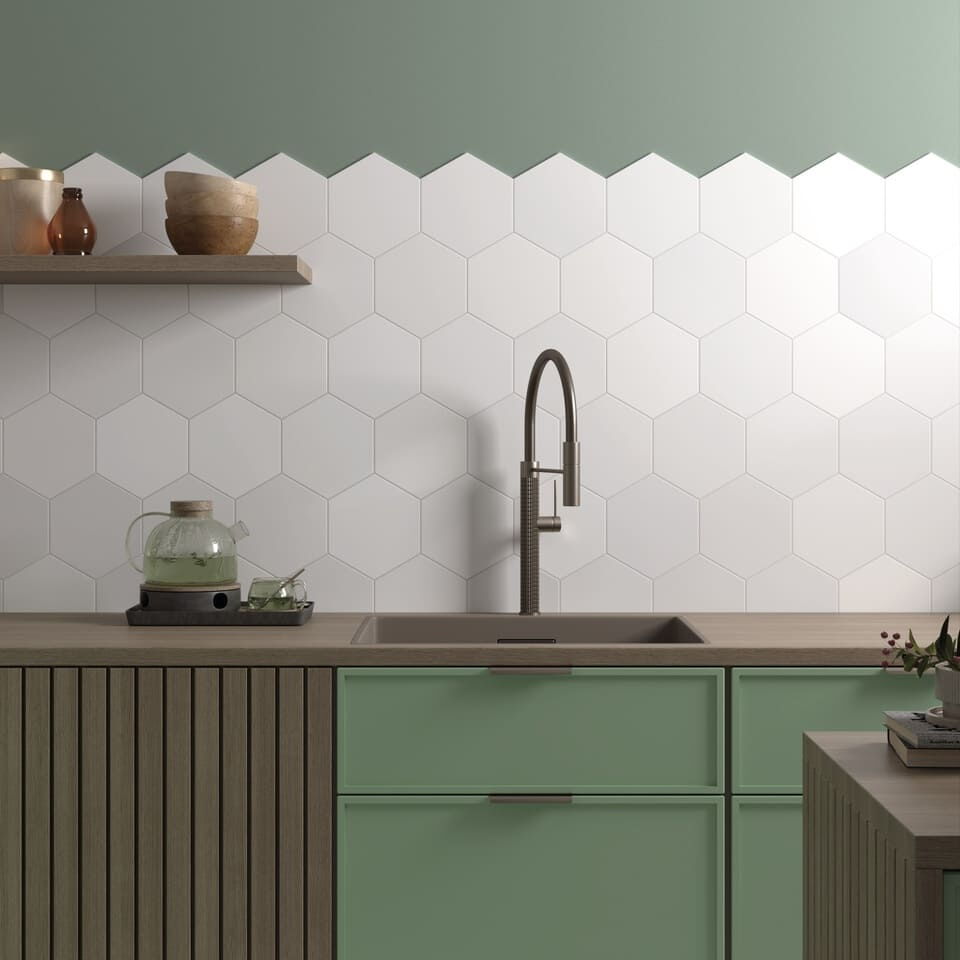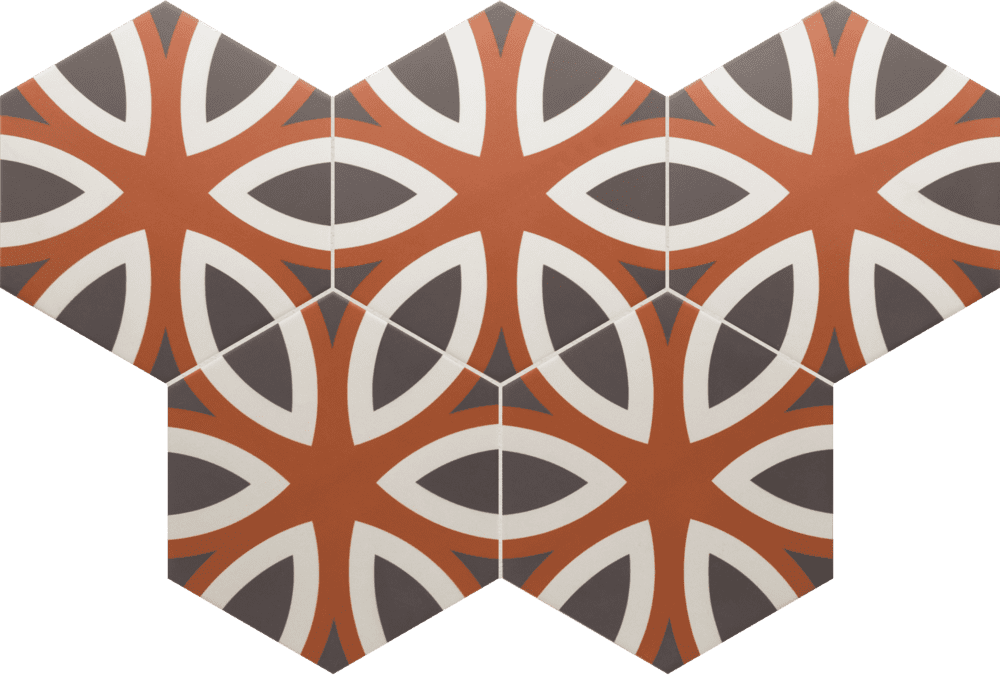 Feinsteinzeugfliesen für den Boden und die Wand. Hexagon/Sechseckformat. Feine Oberflächenanmutung. Mit und ohne Dekor. Format: 17,5 x 20 cm. Rutschfestigkeit: R9-B, Klasse 2*