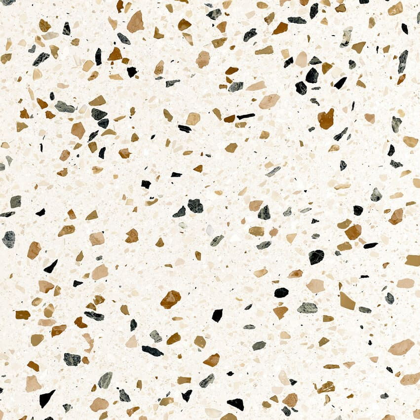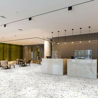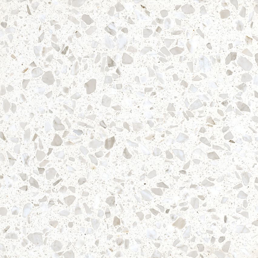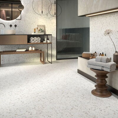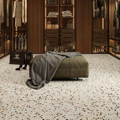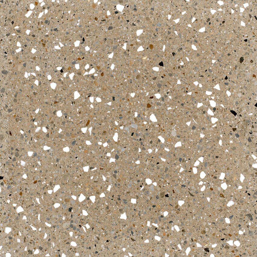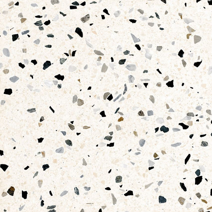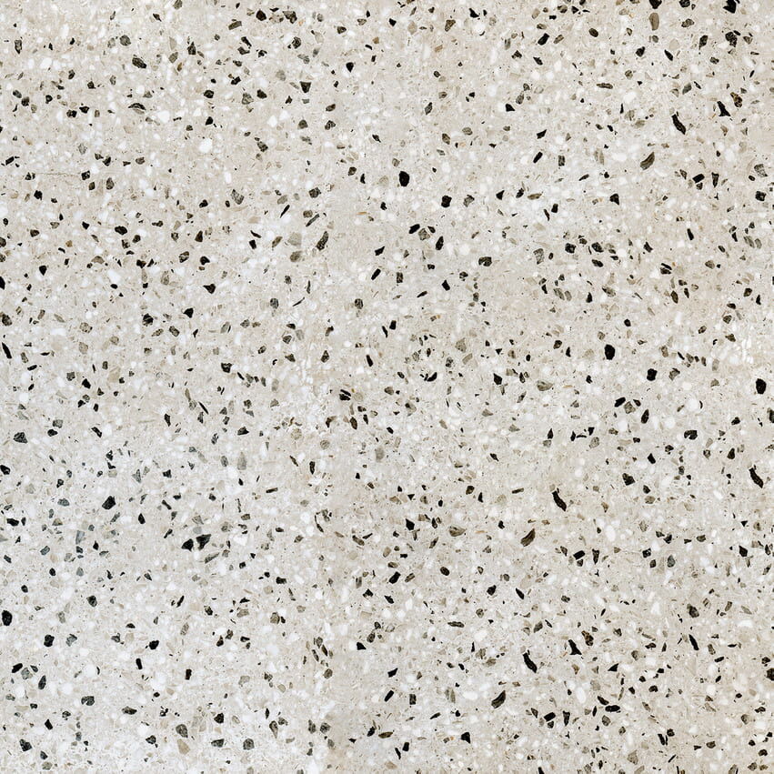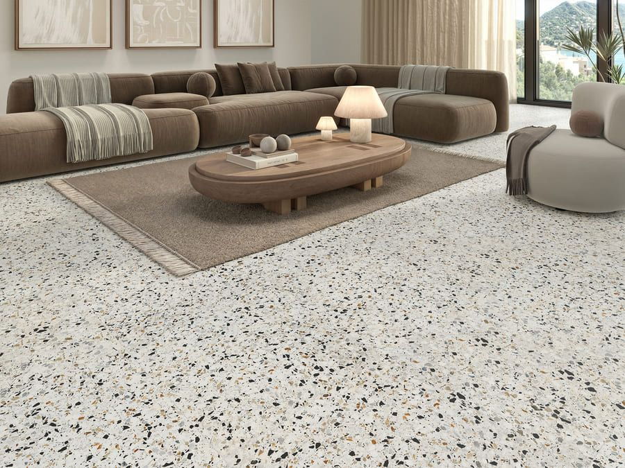 Feinsteinzeugfliesen im Terrazzo-Stil (Terrazzo-Optik). Zwei Formate: 60 x 60 cm und 100 x 100 cm. Dicke: 95 mm. Rutschhemmung: R10*, Abriebfestigkeit: PEI4.*