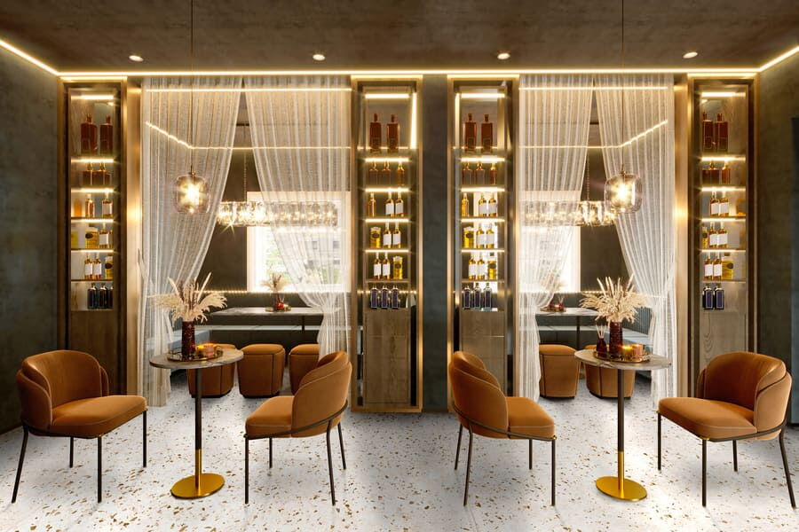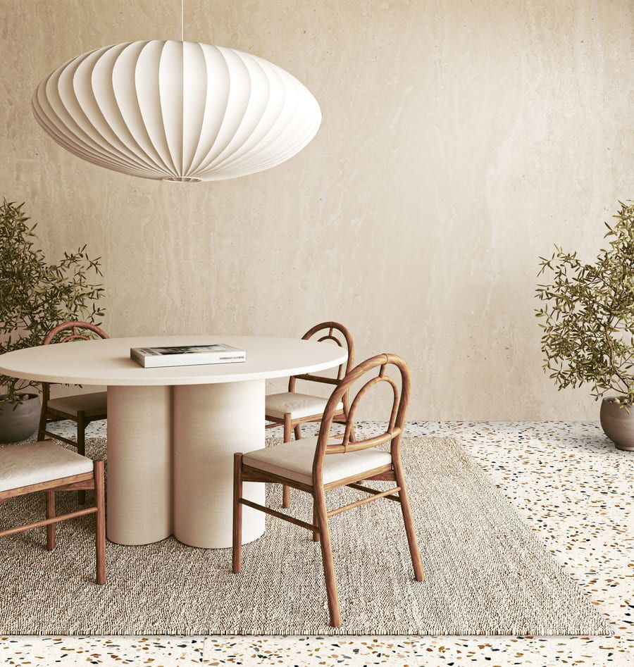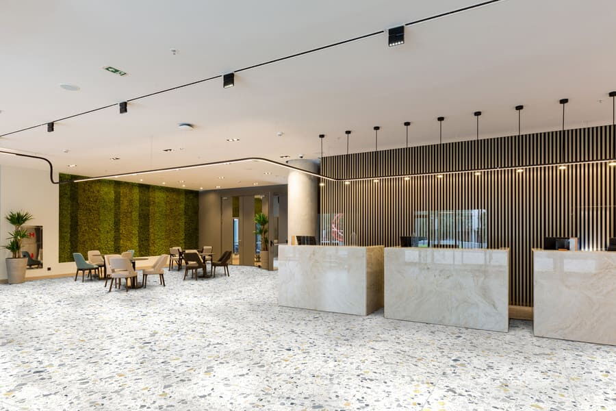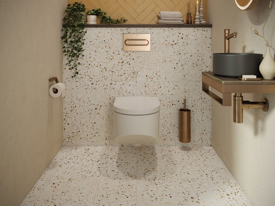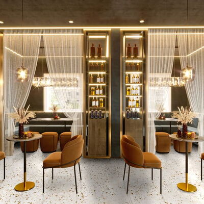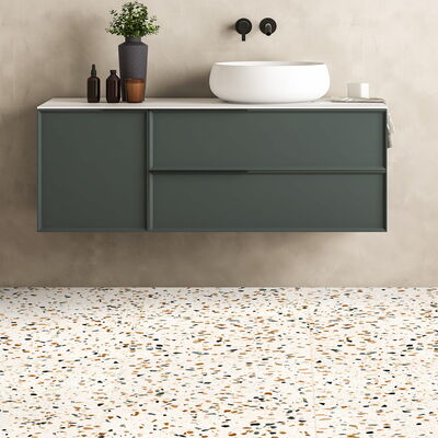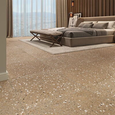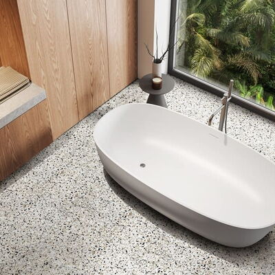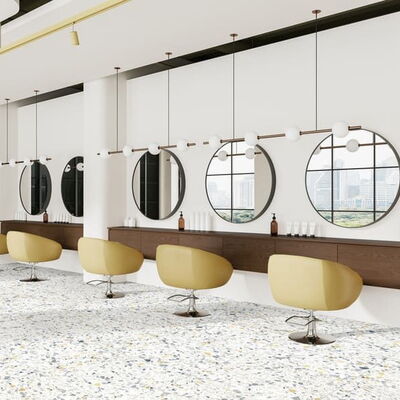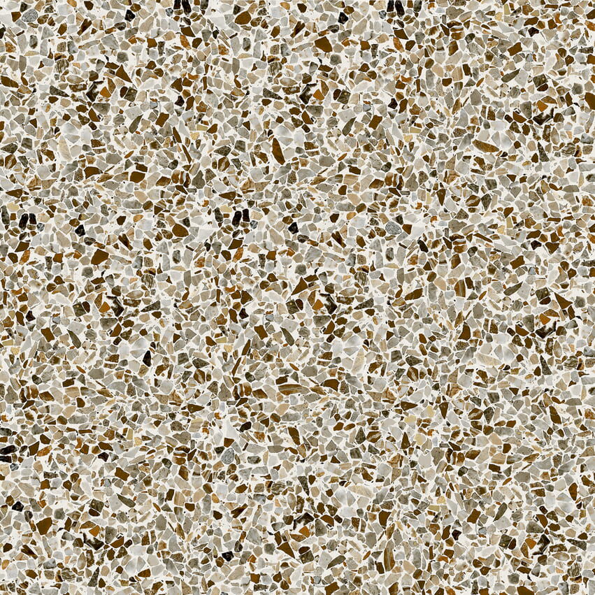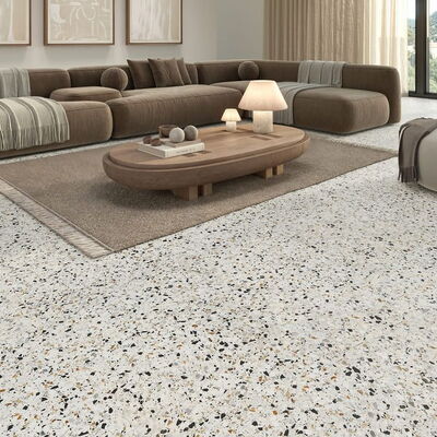 Feinsteinzeugfliesen im Terrazzo-Stil (Terrazzo-Optik). Zwei Formate: 60 x 60 cm und 100 x 100 cm. Dicke: 95 mm. Rutschhemmung: R10*, Abriebfestigkeit: PEI4.*