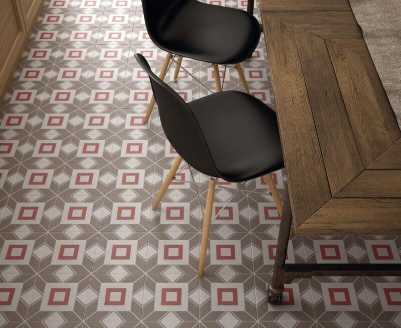 Feinsteinzeugfliesen, wie etwa die Bodenfliesen von Equipe, zum Beispiel Caprice, oder von Revoir Paris, wie etwa die Serien La Madeleine oder La Villette sind Keramikfliesen für den Boden mit Zementfliesenornamenten.