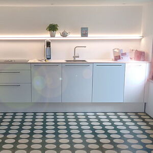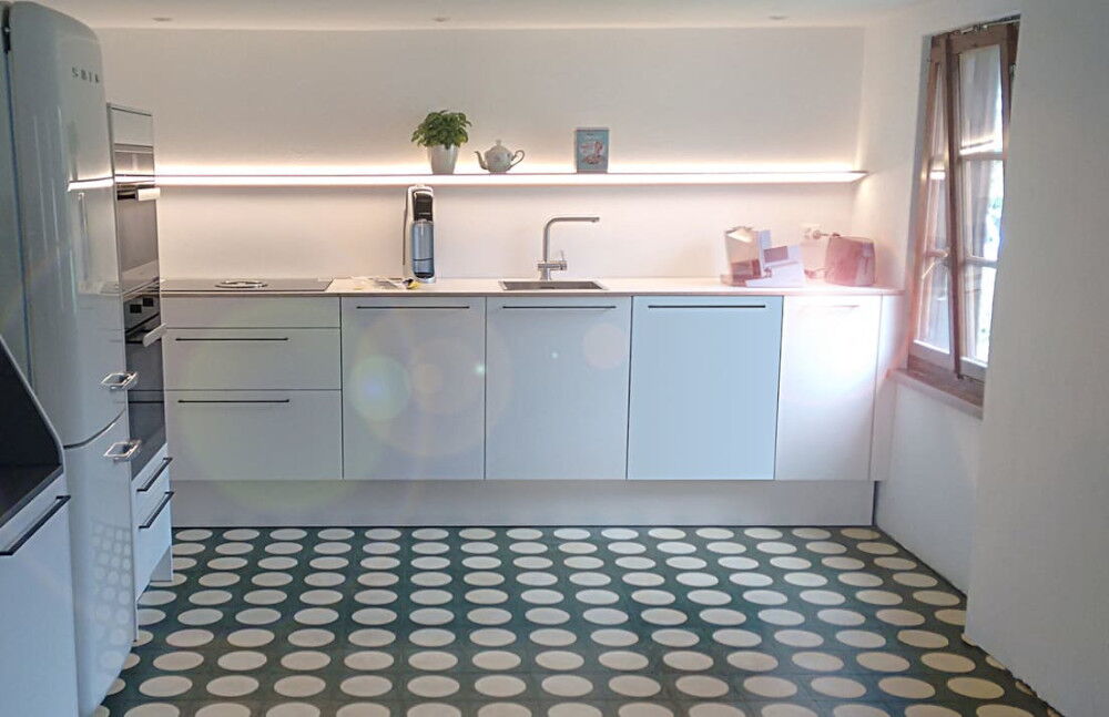 Entscheiden Sie sich bei Ihren Küchenfliesen für Zementfliesen, sollten Sie die Verlegung einem erfahrenen Fachmann überlassen. Sind Zementfliesen unbehandelt, sind sie offenporig. Das heißt: Schmutz kann in die Fliesen einziehen und lässt sich dann nicht mehr entfernen. Daher ist es wichtig, dass Zementfliesen bei der Verlegung sowohl sauber als auch trocken sind. Nach der Verlegung gilt es die Fliesen abermals gründlich zu reinigen. Des Weiteren empfehlen wir Ihnen, einen Fleckstopp als Imprägnierung aufzutragen. Er beugt dem Eindringen von Schmutz in Ihre neuen Küchenfliesen vor.