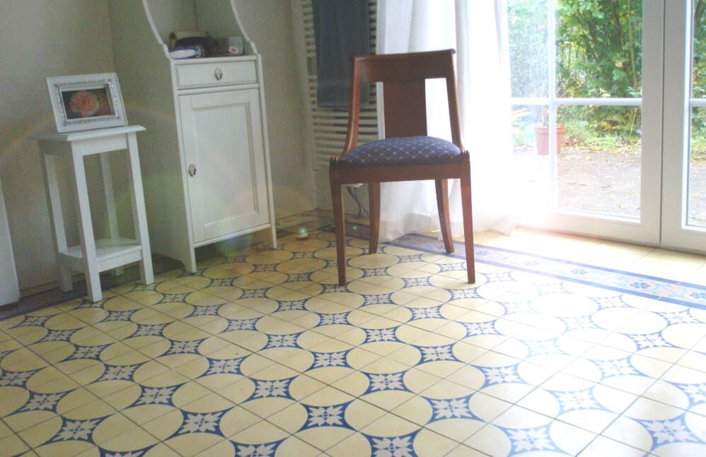 - Feinsteinzeugfliesen mit den Dekoren der Zementfliesen: Für alle Räume, in denen die handgefertigten Retro-Fliesen wegen ihrer Aufbauhöhe nicht infrage kommen. Keine Retro-Fliesen im eigentlichen Sinne, aber eine wunderbare Alternative zu Zementfliesen.