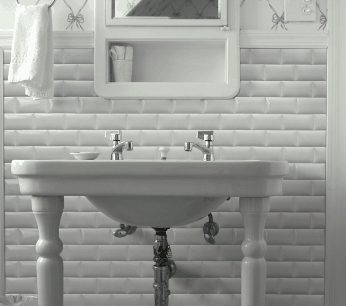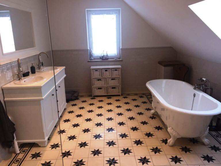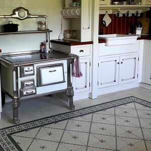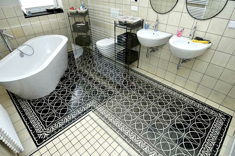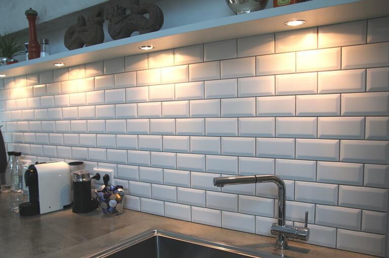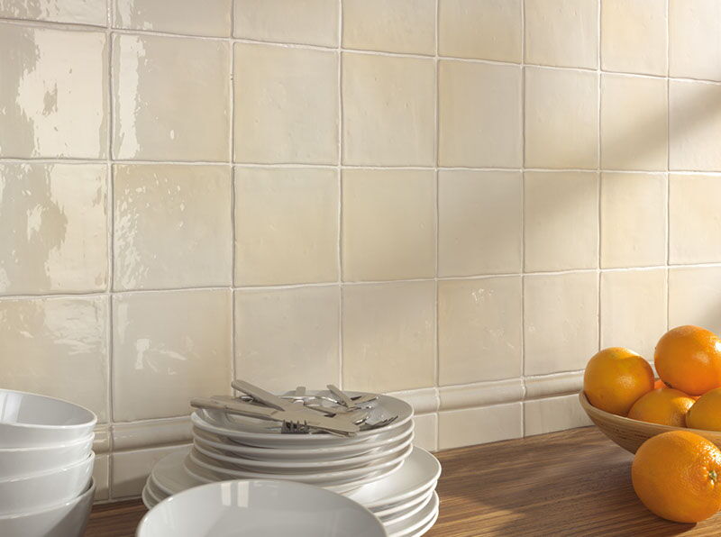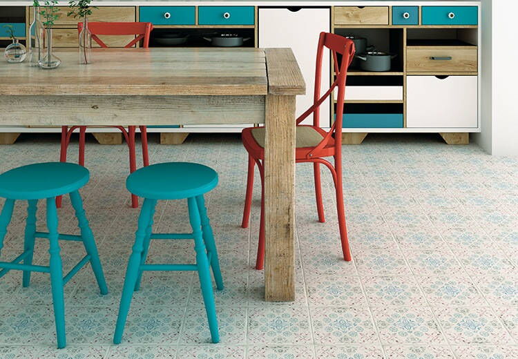 Oder Keramikfliesen (Steingutfliesen, Steinzeugfliesen bzw. Feinsteinzeugfliesen) – überwiegend in kleinen Formaten wie zum Beispiel Metrofliesen oder spanische Fliesen im Vintage- oder Antik-Stil samt Bordüren.