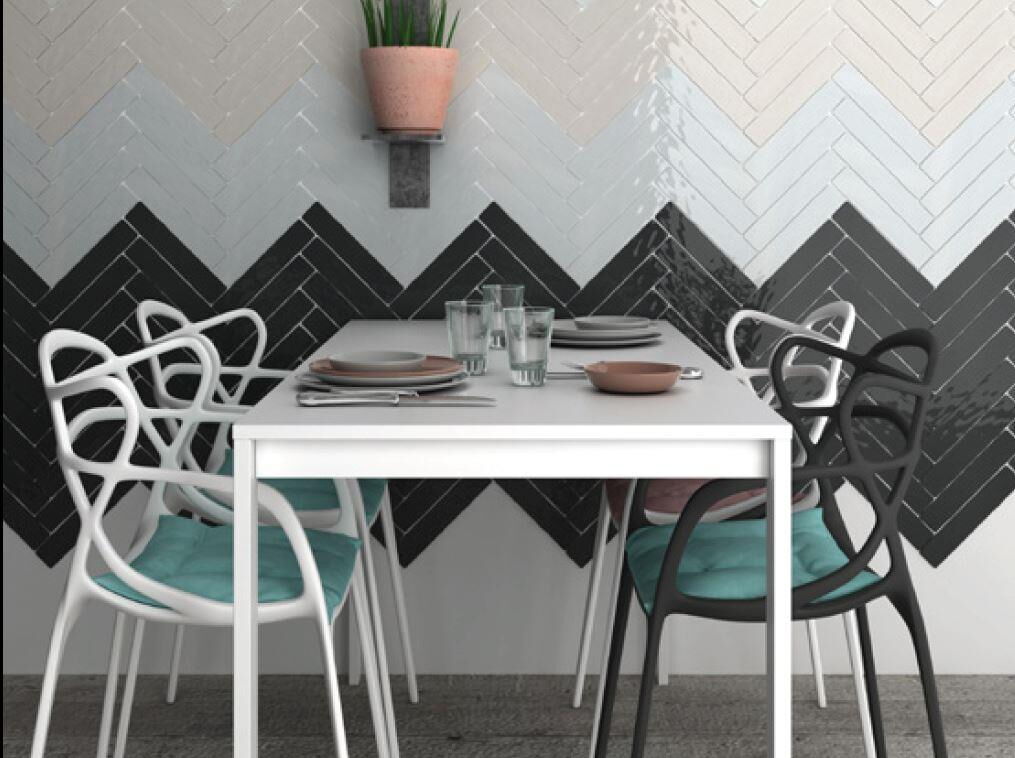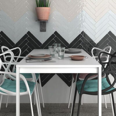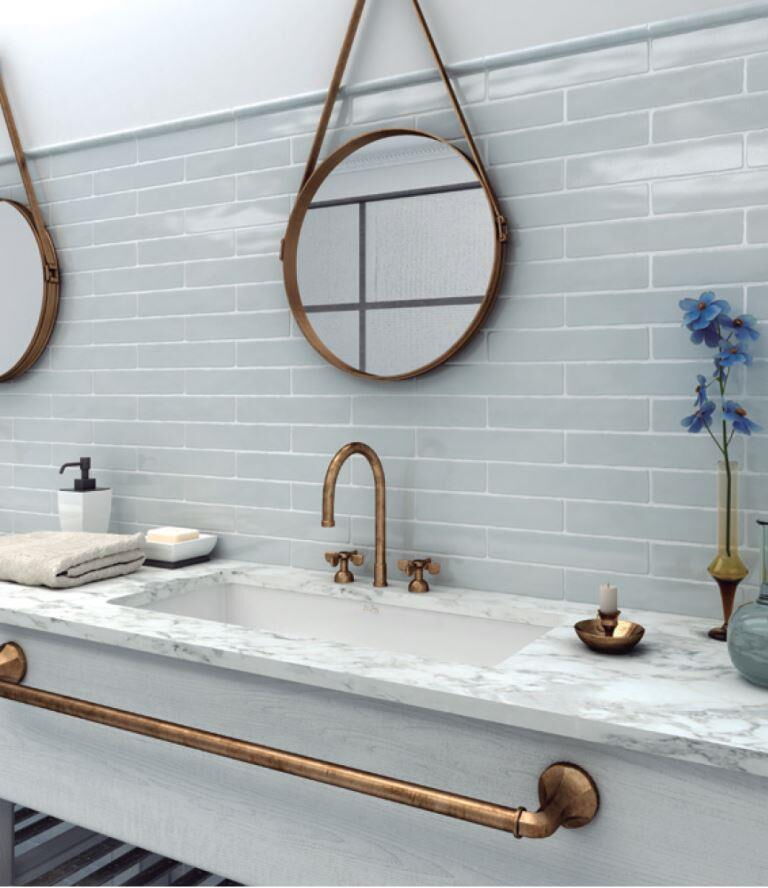 Wandfliesen im Format 5 x 25 cm. Diese Fliesen sind in Einheiten von 0,5 Quadratmetern (40 Fliesen) erhältlich.