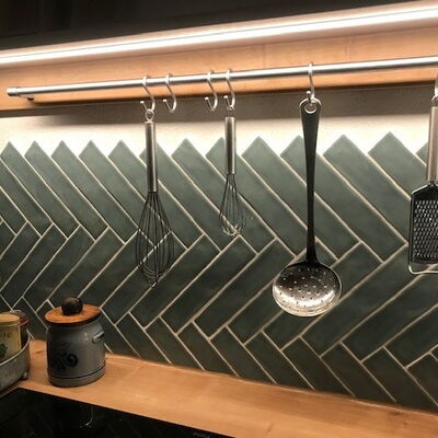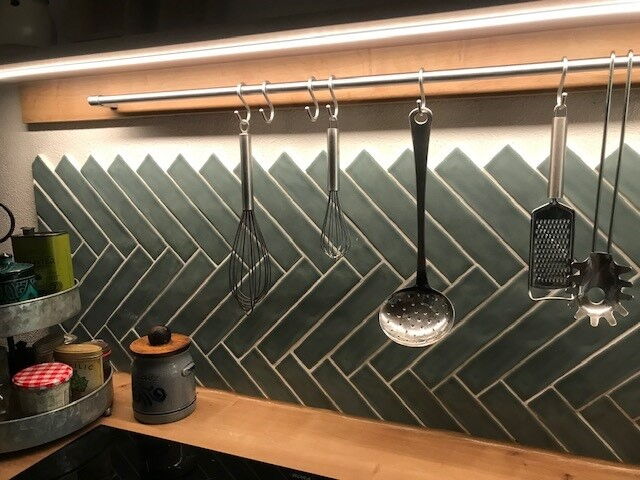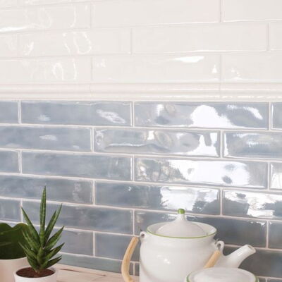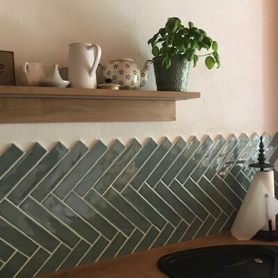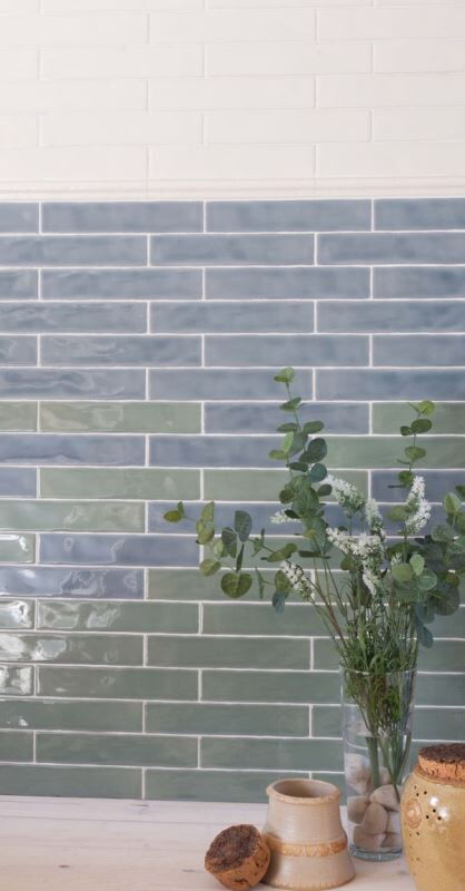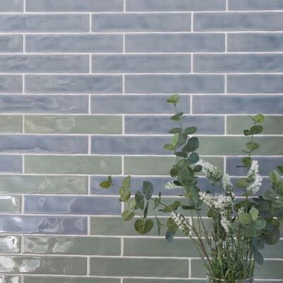 Wandfliesen im Format 5 x 25 cm mit Craquelé-Oberfläche. Alle Basisfliesen sind nur in vollen Kartons à 40 Fliesen (0,5 m²) erhältlich.
