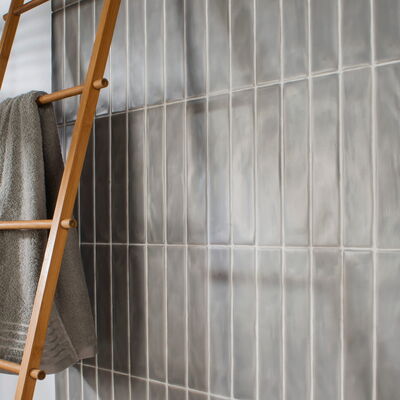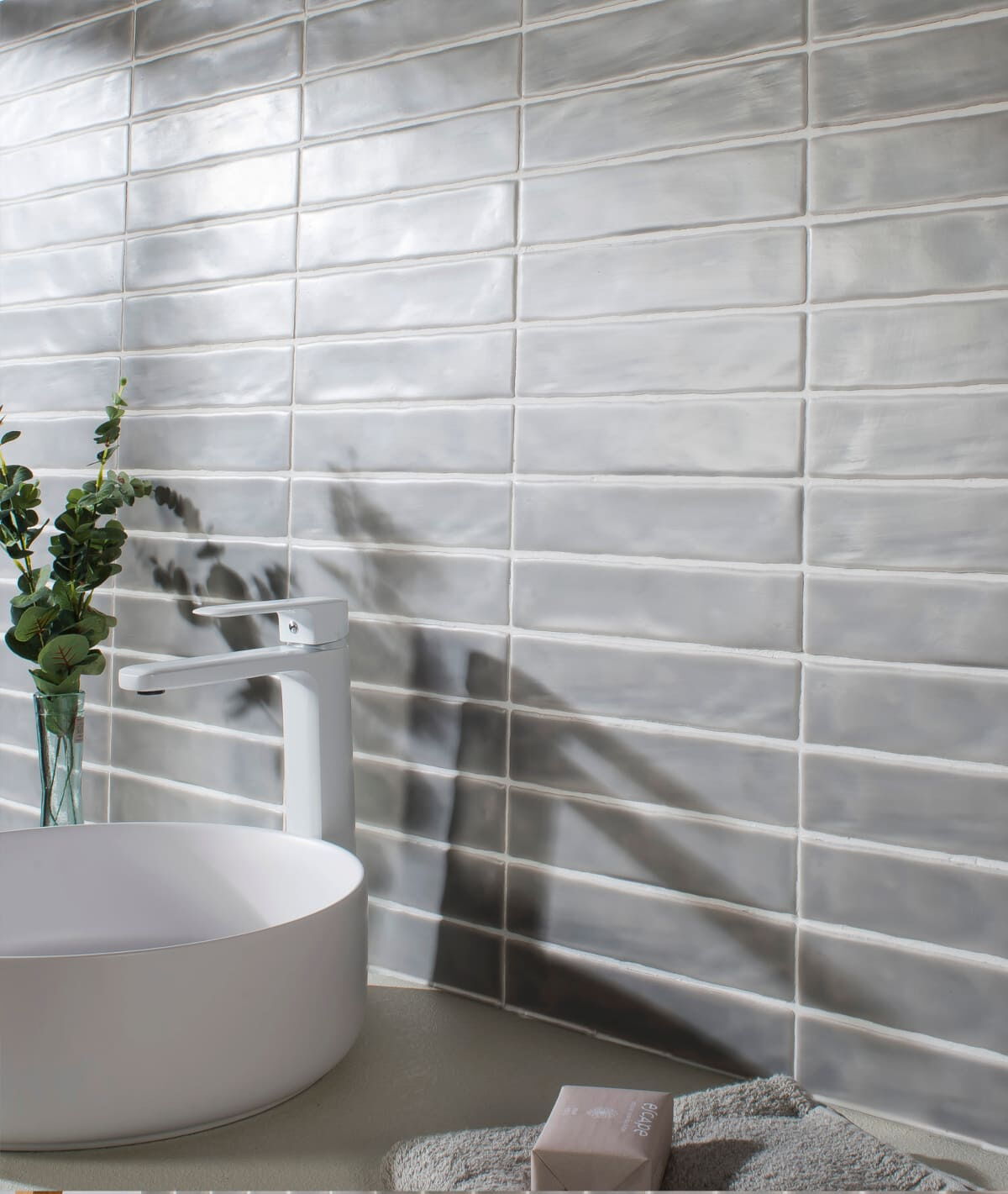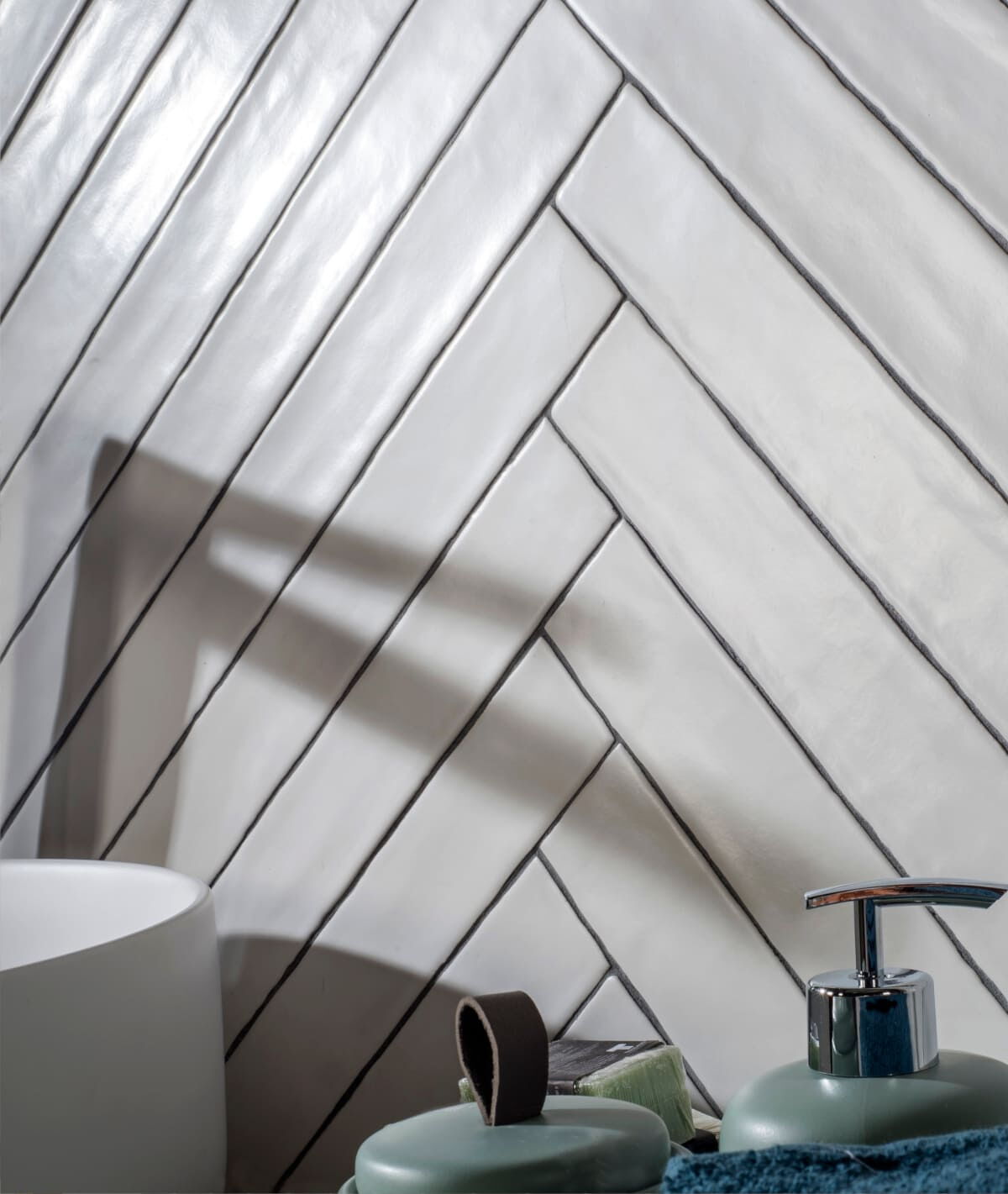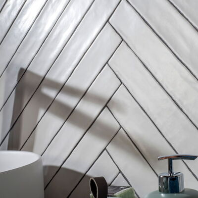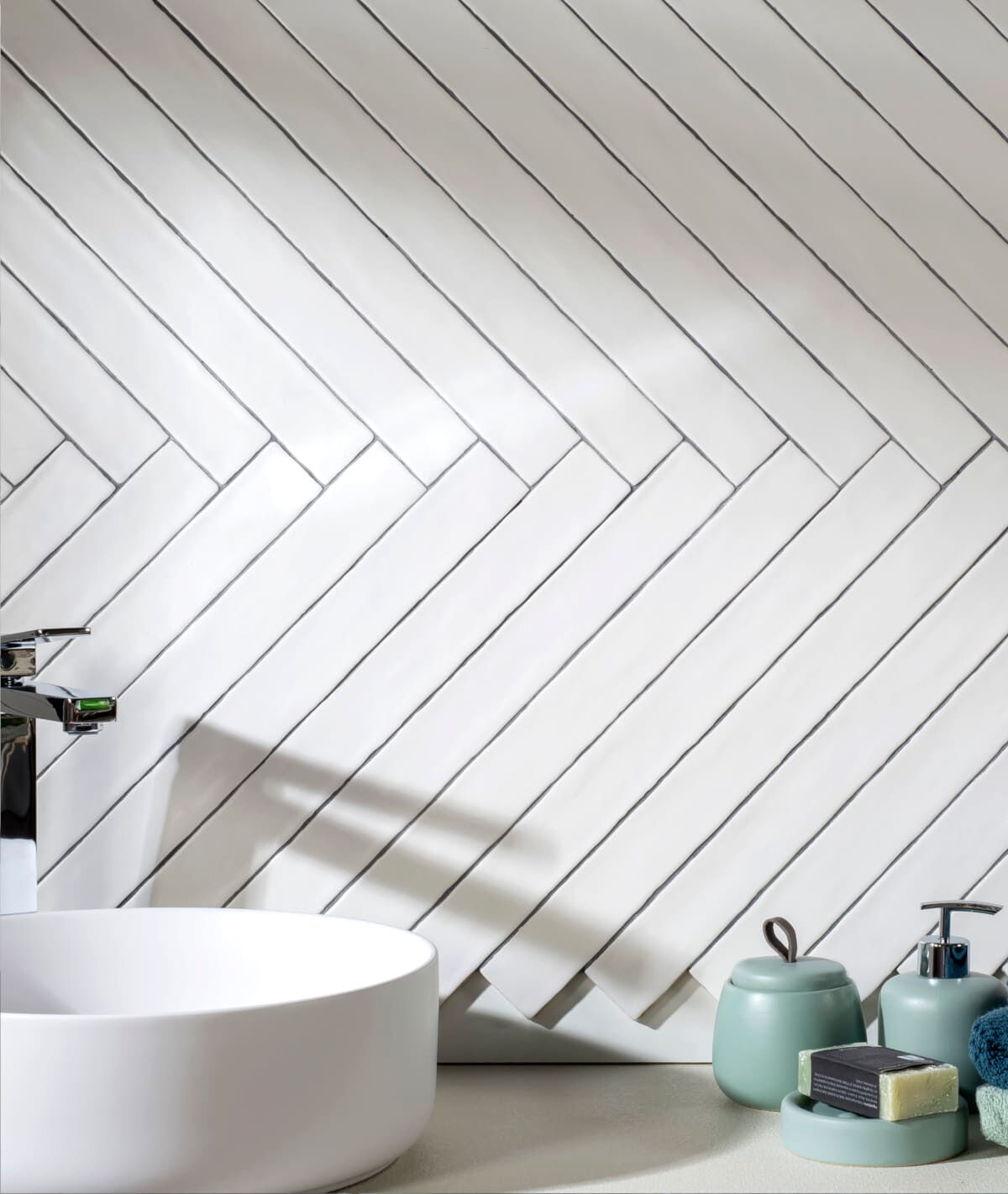 Steingutfliesen (Keramik) aus weißem Ton mit leicht unregelmäßigen Kanten. Seidenmatt glänzende Oberfläche, gebrannt im Doppelbrandverfahren mit natürlichen Glasuren. Trendiges Langformat 5x50 cm bzw. 5x25 cm. Vielseitige Gestaltungs- und Kombinationsmöglichkeiten. Diese Fliesen passen gut zu Terrakotta, Parkett oder Zementfliesen. Ideal für Küche und Bad im dezenten Vintage-Style. Geeignet für Innenräume im privaten und gewerblichen Bereich.
