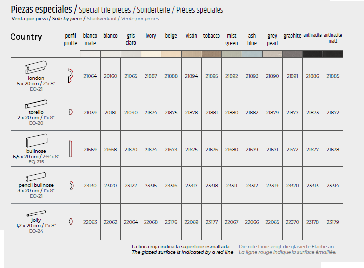Keramische Wandfliesen in den Formaten 13,2 x13,2 cm, 6,5 x 20 cm, 6,5 x 40 cm und 13,2 x 40 cm.